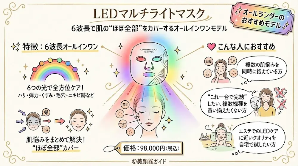 | LEDマルチライトマスク | 6波長搭載の最上位。シミ・くすみ・色素沈着までトータルにアプローチ。 | 美白・透明感を徹底的に高めたい人/肌全体を底上げしたい人 | 98,000円 | 赤+近赤外線+深部近赤外線+青+黄+緑 |