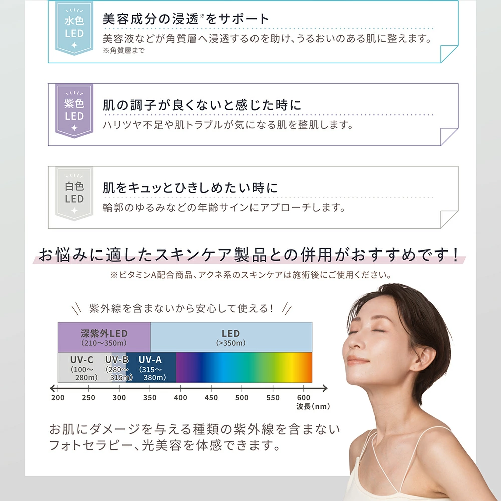 3波長(赤、近赤外、深部近赤外線)7色(赤、青、緑、黄、紫、水色、白)