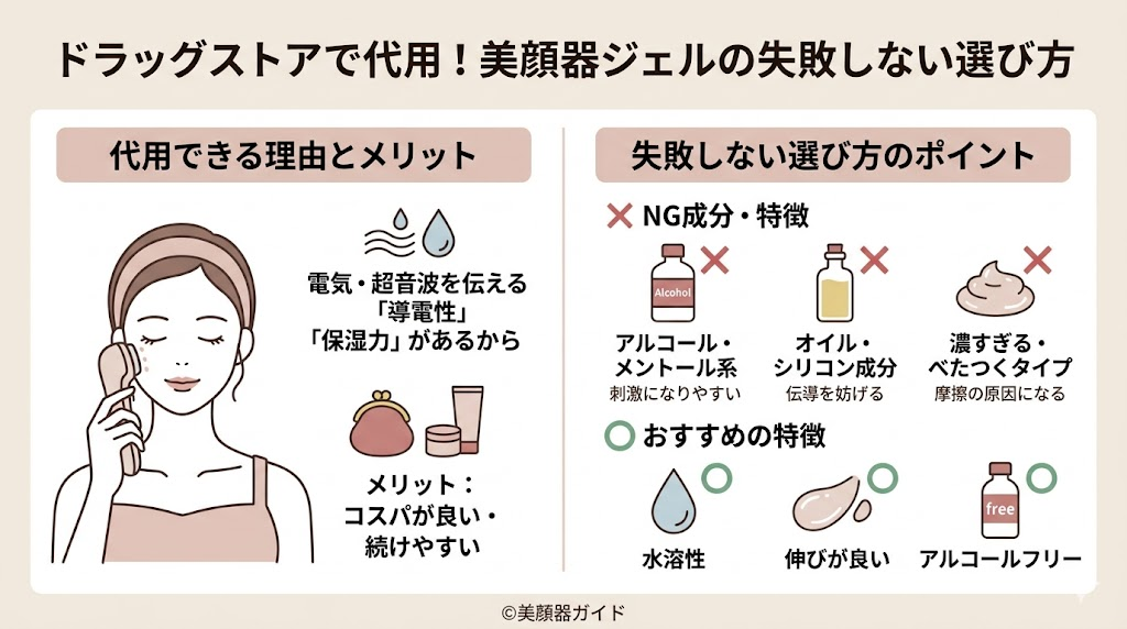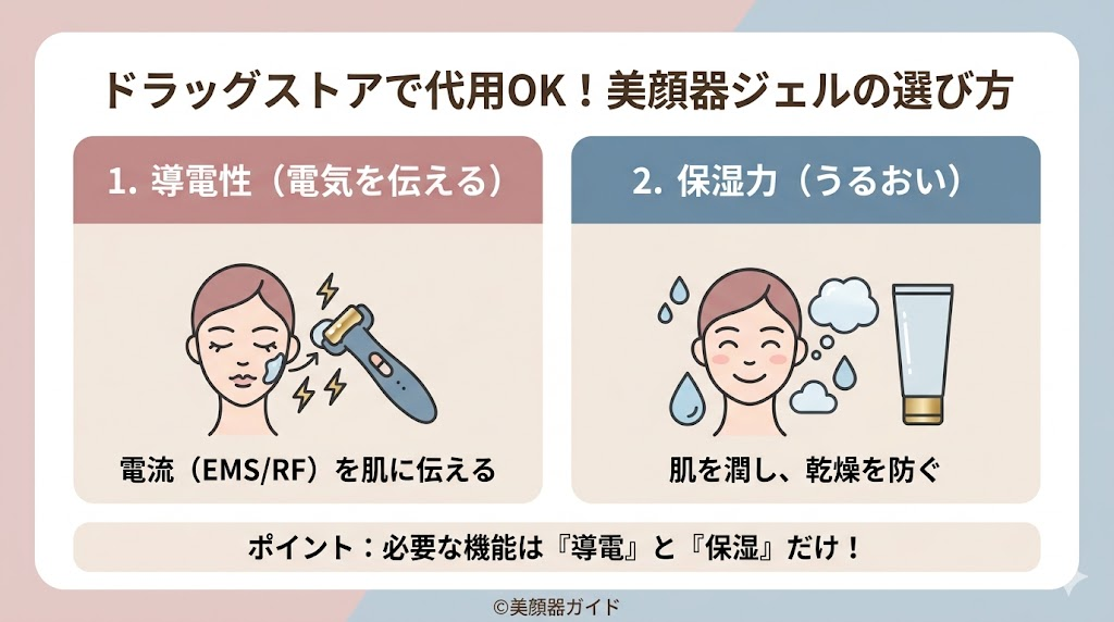 まずは公式推奨品を優先。ただし、導電性・粘度・低刺激の条件を満たせば、ドラッグストアジェルでも代用できるケースが多いです。