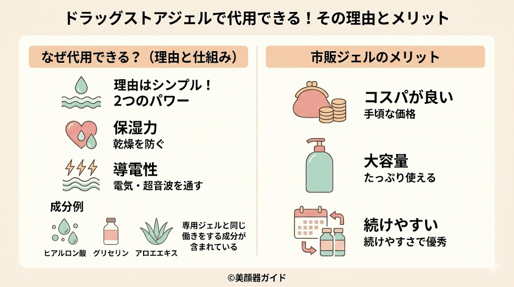 ドラッグストアのジェルにも、ヒアルロン酸・グリセリン・アロエエキスなど、電気を通しやすく保湿する成分が含まれており、専用ジェルと同じように働く製品も多いのです。
