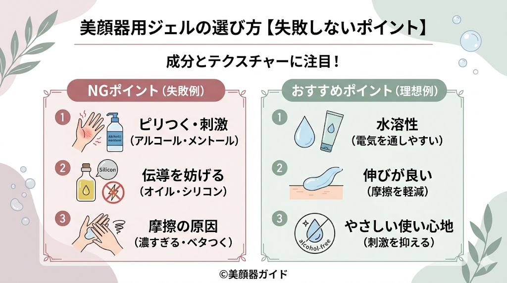 ジェル選びで失敗しやすいポイントは「成分」と「粘度(テクスチャー)」。