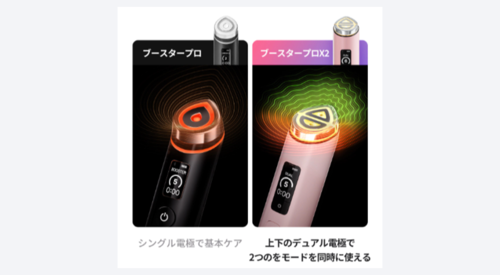 ただしブースタープロX2(新型)ヘッドの拡大やデュアル電極構造の採用、マスクパックモードがあるので、浸透させる仕組みや効率は圧倒的に進化しています!